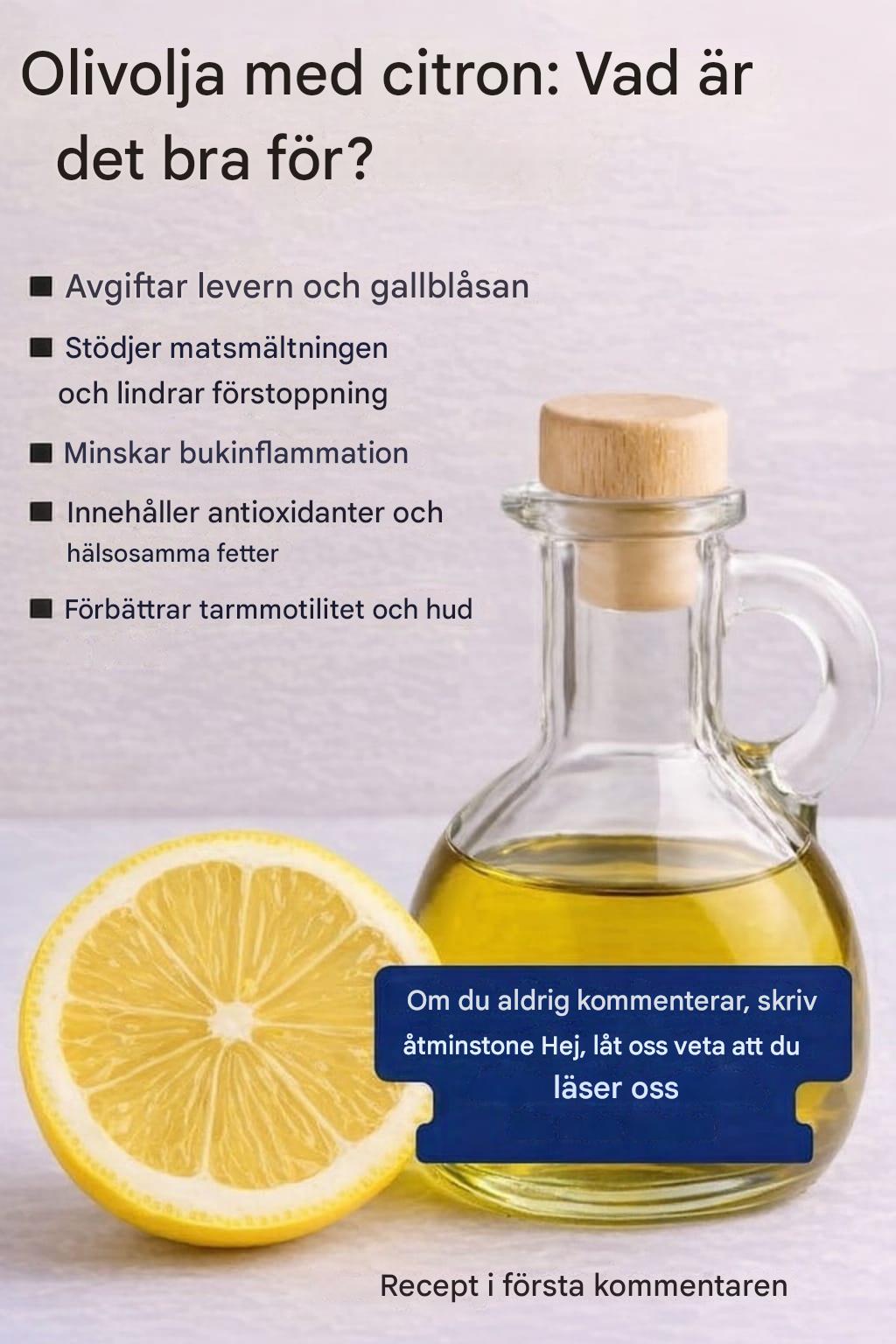 I naturläkemedlens värld finns det få kombinationer som är så enkla men kraftfulla som olivolja och citron. Denna naturliga blandning, som har använts i århundraden inom traditionell medelhavsmedicin, fortsätter att bli populär, och modern forskning bekräftar dess många hälsofördelar. Att dricka olivolja och citron på fastande mage är en daglig vana som kan hjälpa till att rena kroppen, förbättra matsmältningen och främja det allmänna välbefinnandet. Nedan hittar du 25 beprövade och traditionella fördelar med att använda olivolja och citron, plus hur man tillagar det på rätt sätt. 1. Förbättrar matsmältningen Olivolja stimulerar gallproduktionen, medan citron aktiverar matsmältningsenzymer, vilket hjälper magen att bearbeta mat mer effektivt. 2. Lindrar förstoppning Denna kombination fungerar som ett naturligt smörjmedel för tarmarna, vilket främjar smidigare tarmrörelser. 3. Stödjer leveravgiftning Olivolja och citron stimulerar leverfunktionen och hjälper kroppen att eliminera ackumulerade gifter. 4. Förbättrar njurfunktionen Citron fungerar som ett milt naturligt diuretikum som främjar njurrengöring och urinflöde. 5. Stärker immunförsvaret C-vitamin från citron i kombination med antioxidanterna i olivolja hjälper till att stärka kroppens naturliga försvar. 6. Reglerar kolesterolnivåerna Extra jungfruolja hjälper till att sänka LDL (dåligt kolesterol) samtidigt som den ökar HDL (godt kolesterol). 7. Skyddar hjärthälsan Hälsosamma enkelomättade fetter förbättrar blodcirkulationen och minskar hjärt-kärlbelastning. 8. Minskar ledinflammation Olivolja innehåller naturliga antiinflammatoriska föreningar som kan lindra ledbesvär. 9. Förbättrar hudens utseende Dess närande fetter och antioxidanter hjälper till att återfukta huden och främja en ungdomlig lyster. 10. Bekämpar fria radikaler Båda ingredienserna är rika på antioxidanter som skyddar celler från oxidativa skador. 11. Främjar viktminskning Intaget på morgonen kan hjälpa till att kontrollera aptiten och stimulera ämnesomsättningen. 12