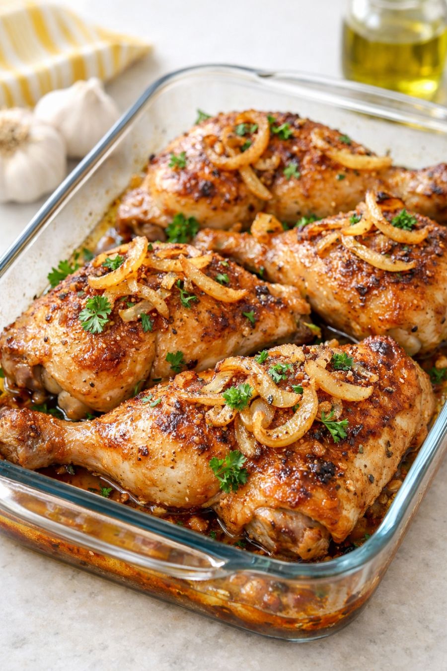 Ringla vegetabilisk olja över botten av glasformen och lägg sedan kycklinglåren i ett enda lager med skinnsidan uppåt. Om de är trånga, lägg dem tätt intill varandra men undvik att stapla dem.