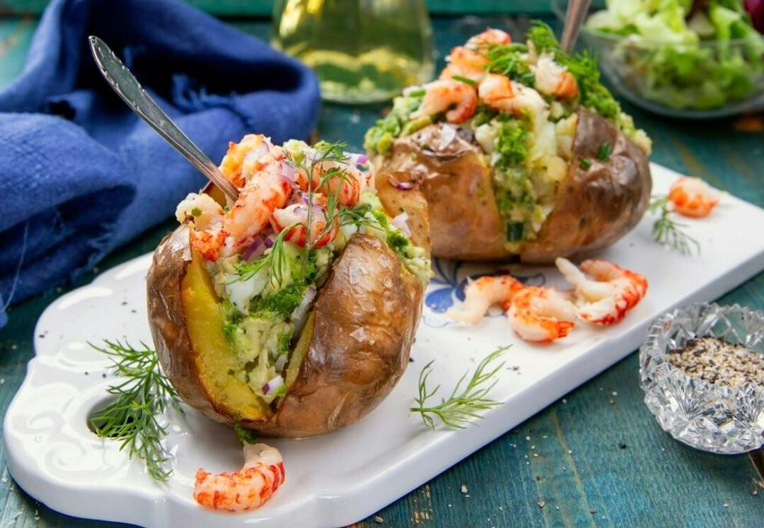 Bakad potatis toppad med avokado, ägg och kräftstjärtar