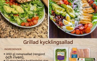 Ingredienser (4 portioner) 1 romansallad (tvättad och hackad) 2 kycklingbröst (grillade och skivade) 100 g krispigt bacon 200 g körsbärstomater…
