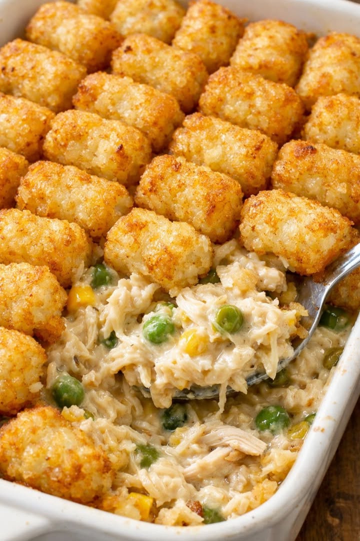 Min granne Helen dök upp med den här grytan veckan jag kom hem från operationen, fortfarande varm från hennes ugn, med en lapp tejpad på toppen. Jag tog en tugga – krispiga tater tots ovanpå, krämig kyckling under – och frågade omedelbart efter receptet. När hon berättade att det bara var tre ingredienser trodde jag henne nästan inte. Nu har jag allt till hands och slänger ihop det de kvällar när jag är trött, barnen är hungriga och jag behöver något tröstande som i princip gör sig självt. Det är den typen av enkelt, krångligt småstadsrecept som delas ut på kyrkans knytkalas och aldrig kommer hem med rester.