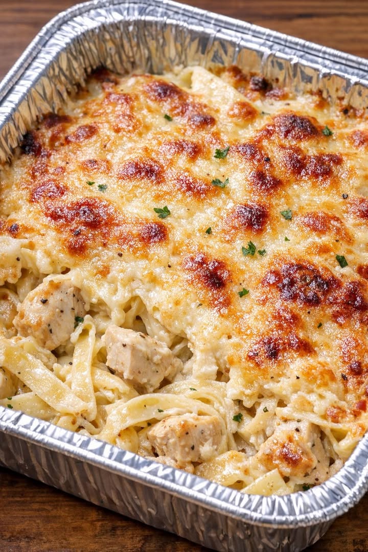 Denna ugnsbakade kyckling-alfredo-gratin med fyra ingredienser är precis den typ av middag min upptagna syster lutar sig mot när hennes barn har övningar, läxor och alla svälter samtidigt. Den använder bara några snabbköpsgenvägar – alfredo i burk, grillad kyckling och riven ost – plus torr pasta, och allt gräddas tillsammans i en engångsform av folie. Nudlarna behöver inte kokas först, inga extra kastruller behöver diskas. Den är ihopsatt på några sekunder, gräddas medan du tar hand om resten av livet, och resterna värms upp som en dröm till luncher eller en annan lättsam middag.