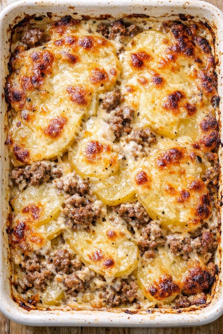 Denna ugnsbakade nötkötts- och potatisgratäng med fyra ingredienser är en av de där stillsamt tröstande grytorna som har funnits i mellanvästerns kök i årtionden. Min granne tog med sig en kastrull av den efter min operation för fyrtio år sedan, och jag gör den fortfarande varje vår när vädret inte kan bestämma sig mellan kyligt och varmt. Den är gjord på enkla basvaror – tunt skivade potatisar, kryddad nötfärs, en burk kondenserad gräddsoppa och ett täcke ost – i lager till en bubblande, gyllenbrun gryta. Det finns inget krångligt här: bara enkel, praktisk matlagning som ger en mysig, välbekant smak och en textur som landar någonstans mellan gratinerad potatis och en cheeseburgergratäng.