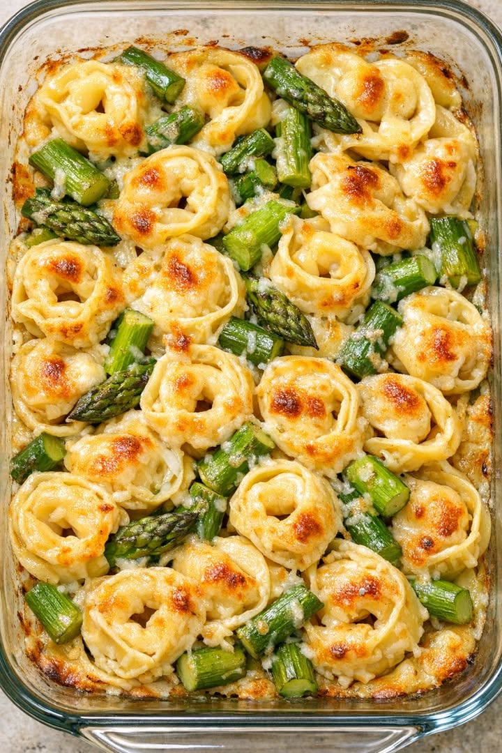 Denna ugnsbakade sparris- och osttortellini med fyra ingredienser är en av de där enkla vårmiddagarna som känns extra speciella utan mycket krångel. Det började som något mitt barnbarn slängde ihop efter en hektisk skoldag, med det vi hade till hands: färsk sparris, en påse osttortellini, en burk sås och en näve riven ost. Sparrisen håller sig ljus och mör-krispig, tortellinin blir mysig i en krämig sås, och osten ovanpå blir gyllenbrun och bubblande. Det är en tröstande, familjevänlig bakning som är enkel nog för en vardagskväll men tillräckligt fin för att dela när gäster tittar förbi.