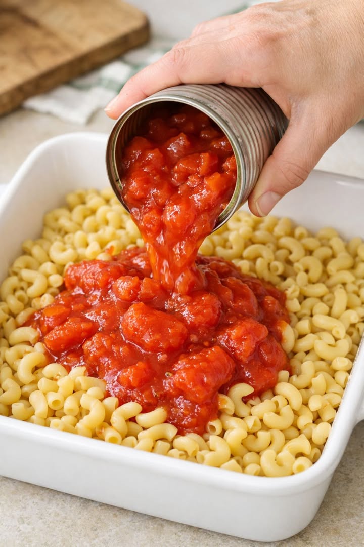 Denna ugnsbakade gulasch i Amish-stil med fyra ingredienser är den sortens enkla, djupt tröstande middag som har dykt upp på kyrkbord och lantkök i mellanvästern i generationer. Allt är byggt kring ett enkelt knep: du häller konserverade stuvade tomater och två basvaror direkt över okokta makaroner i en ugnsform och låter sedan ugnen göra jobbet. Det är den typen av recept du kan laga en hektisk vardag eller en kall söndagskväll när du vill ha något varmt, välbekant och mättande utan att stå över spisen. Smakerna är milda och hemtrevliga, med mjuk pasta, smakrik nötfärs och en krämig, tomatrik sås som känns som om den har funnits i familjen i åratal.