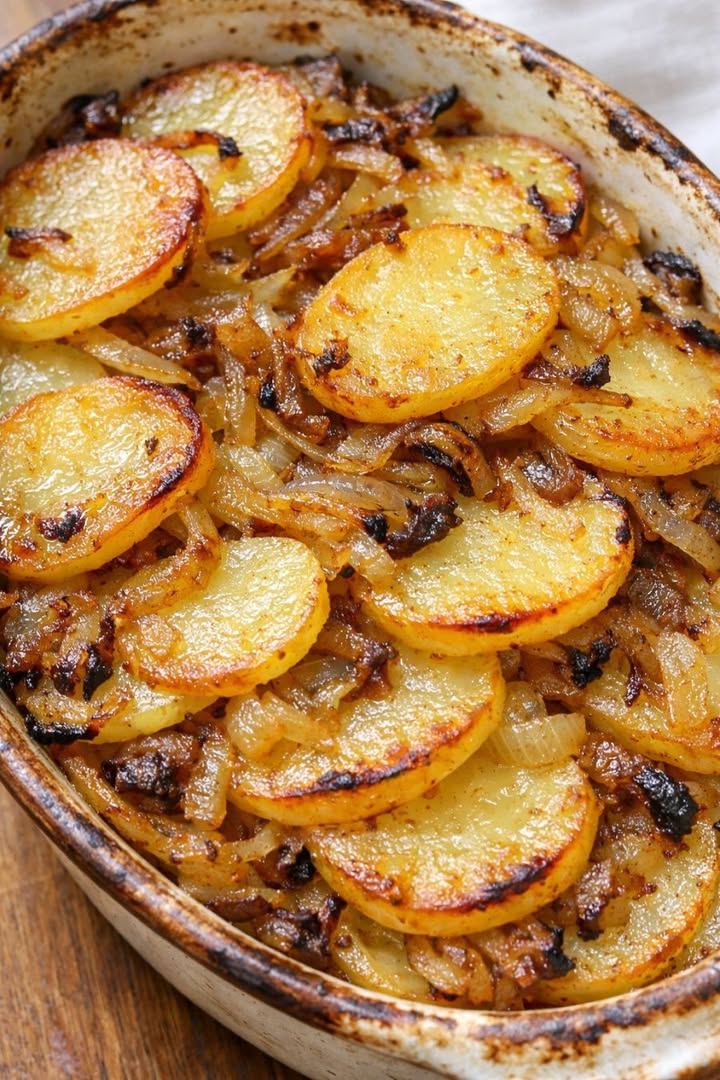Dessa ugnsbakade Lyonnaise-potatisar med 3 ingredienser är min nedskalade version av rätten som min mormor lagade varje söndag efter kyrkan. Klassiska Lyonnaise-potatisar kommer från Lyon-regionen i Frankrike och är kända för sin enkla kombination av potatis, lök och fett, tillagade tills allt blir gyllene och krispigt i kanterna. Den här versionen håller fast vid den andan men är mer strömlinjeformad för en hemmagrill: bara potatis, lök och smör, varvade i en gryta och bakade tills löken är djupt gyllenbrun och potatisen är mör med krispiga, brynta kanter. Det är den typen av recept du gör en gång och sedan har i bakfickan för stekta kycklingkvällar, knytkalas eller när du vill ha något tröstande som inte kräver mycket krångel.