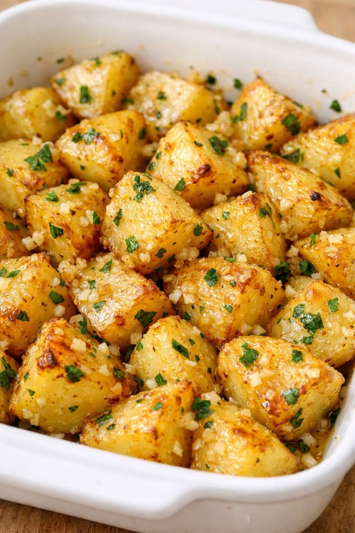Ugnsbakade Amish-smörkryddade vitlökspotatisar med 4 ingredienser