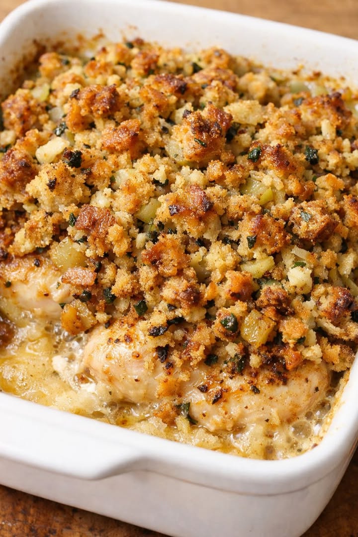 Denna ugnsbakade kycklingfilé med fyra ingredienser är ren söndagsnostalgi för mig. Min mormor brukade komma in till varje familjesammankomst med en stor vit gryta av detta, och jag svär att pannan alltid skrapades helt ren. Det är den typen av mysigt, enkelt recept som känns speciellt men bara tar några minuter att slänga ihop – perfekt för hektiska veckor när man fortfarande vill ha något som smakar som om det har funnits i familjen i generationer. Allt gräddas i en form, fyllningen blir gyllenbrun och krispig på toppen, och en krämig sås bubblar upp runt kanterna och suger in i kycklingen under.