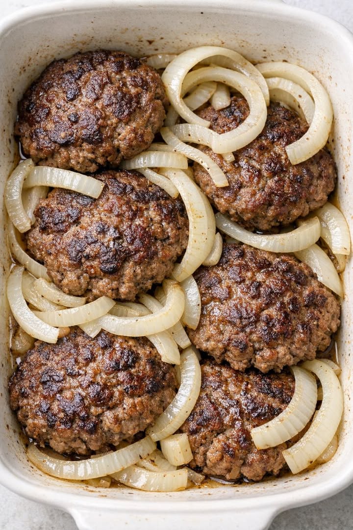 Salisbury-biff är en av de där klassiska mellanvästern-komforträtterna som känns som en varm kram i slutet av en lång arbetsdag. Traditionellt sett är det stekta biffar av kryddad nötfärs som sjuds i en fyllig lök- och svampsås – ungefär som en uppklädd hamburgare som bestämt sig för att ta på sig sin söndagskost. Den här bakade versionen behåller alla de mysiga smakerna men låter ugnen göra det mesta av jobbet, vilket är precis vad jag behöver på kvällar när jag jonglerar e-postmeddelanden, tvätt och listar ut vem som glömt sina skor i hallen igen. Den är budgetvänlig, använder enkla ingredienser från skafferiet och ger fantastiska rester, så den är perfekt för matlagning eller för att mata en hungrig familj utan att sväva över spisen.