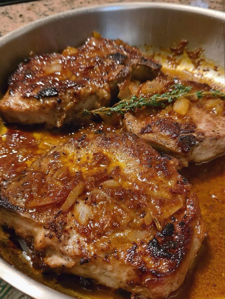 Dagens version av smördegda fläskkotletter innebär att bryna dem i en stekpanna och sedan låta dem rostas i ugnen tills de är perfekt tillagade. Under tiden karamelliserar vi lök, fräser svamp och vispar ihop en fingerslickande sås. Var beredd på en frestande doft som fyller ditt kök, och eventuellt en knottrig mage.