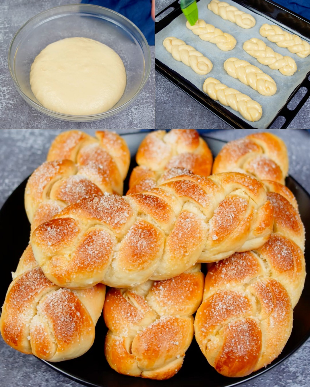 Brioche är en fransk typ av bröd berikad med ägg och smör. Det kan avnjutas i både salta och söta rätter, men för det här receptet bestämde vi oss för att göra söta flätade briocher. För att göra briochen behöver du mjöl, äggulor, mjölk, smör, socker och färsk jäst. Om du inte hittar färsk jäst i en butik nära dig, oroa dig inte, du kan också använda torrjäst. När degen är formad får den jäsa och flätas sedan. Briocheflätorna penslas med äggtvätt (vilket ger den den där vackra guldfärgen) och strös sedan med socker (vilket ger den en krispighet). Bullarna kan avnjutas som de är, eller med ett utsökt frukt- eller chokladpålägg.