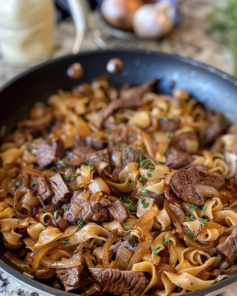 Fransk lökbiff och nudlar