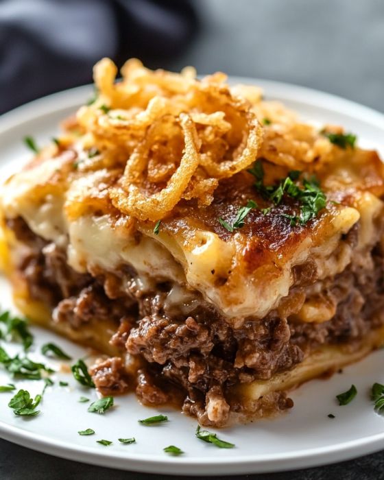 Blanda den kokta pastan med nötkötts- och lökblandningen i en stor gryta. Rör i den schweizeriska osten.