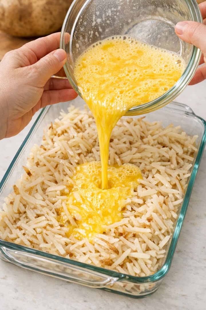 Häll vispade ägg över råa strimlade russetpotatisar, plus två enkla ingredienser, i en glasform för en morgonmåltid som försvinner snabbare än något annat.
