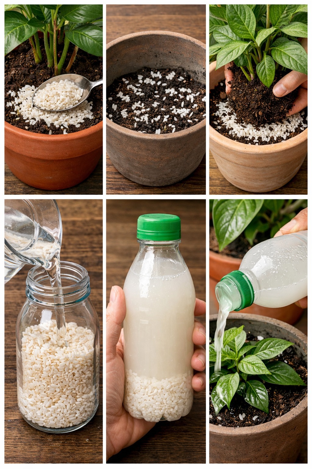 Den här metoden använder ett långsamt frisättande gödningsmedel, så stärkelsen frigörs gradvis från riset. När du vattnar plantorna börjar riset svälla och urlaka sin stärkelse, vilket lämnar det kvar på botten av krukan. Med varje vattning berikas jorden med näringsämnen.