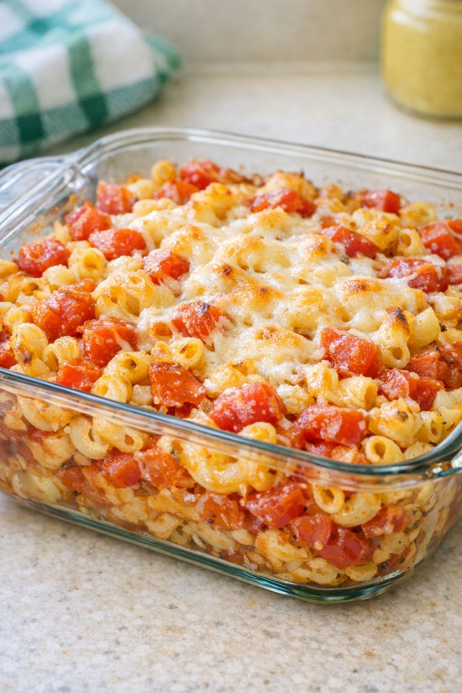 Häll de tärnade tomaterna på burk med all sin saft jämnt över de torra makaronerna i formen. Det ska se ut som att pastan är täckt med tomater.