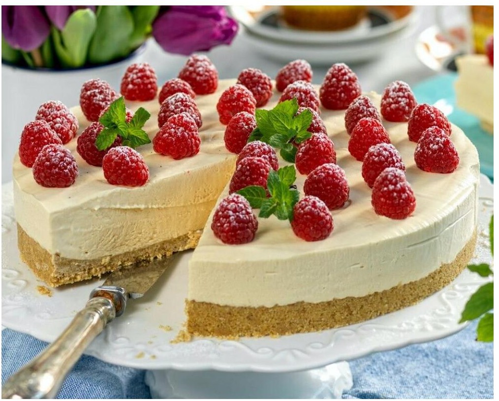 En krÀmig och dekadent cheesecake med en len karamelltopping tack vare dulce de leche och en garnering av fÀrska hallon. Perfekt att göra i förvÀg till speciella tillfÀllen eller festliga eftermiddagste!