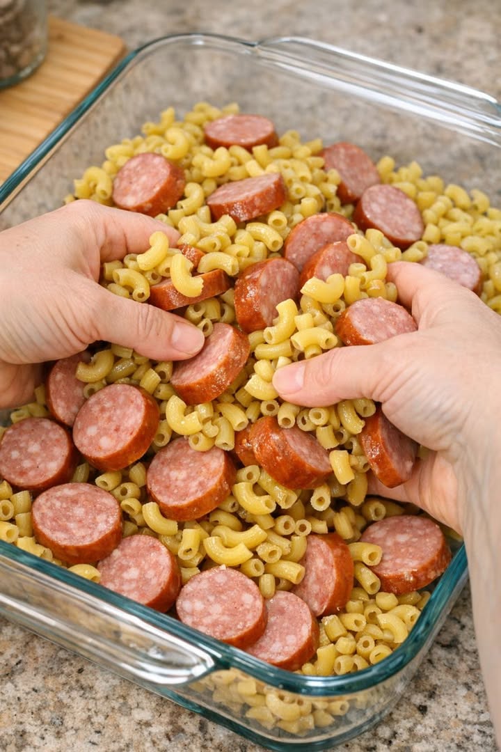 Kasta skivade kielbasa-rundor med rå, torr armbågsmakaroner, plus 3 ingredienser, i en djup glasform för en rejäl festmåltid som är den första.