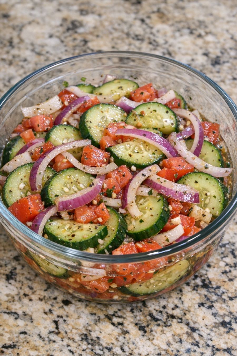 Servera denna sallad väl kyld i en glasskål så att du kan se alla färger – gurkor, tomater och lök som glittrar i marinaden. Den passar utmärkt till grillat eller rostat kött som kyckling, fläskkotletter eller biff, och den är utmärkt till hamburgare, bratwurst eller grillat. För en lättare måltid, lägg den bredvid grillad fisk eller en enkel omelett. Den passar också naturligt till knytkalas, picknick och middagar på vardagskvällar, eftersom den håller sig fint i kylskåpet och faktiskt smakar bättre efter en liten marineringstid. Erbjud lite knaprigt bröd för att suga upp den extra dressingen i botten av skålen.