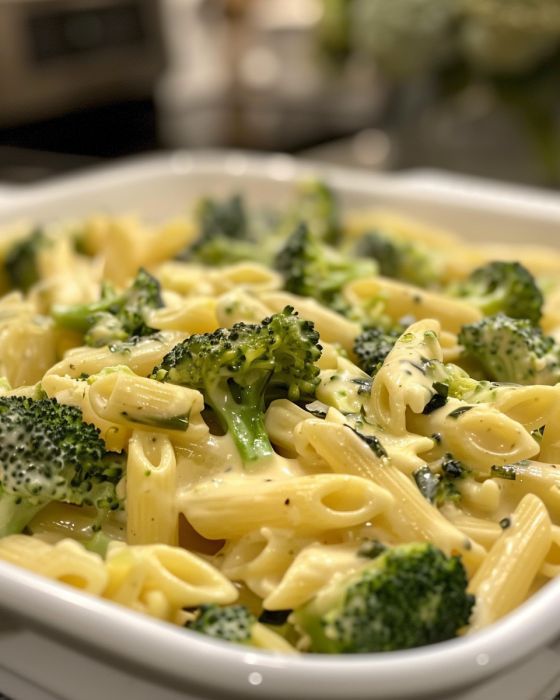 Koka pastan enligt anvisningarna på förpackningen tills den är al dente. Under de sista 2 minuterna av tillagningen, lägg broccolibuketterna i det kokande pastavattnet. Häll av vattnet och ställ åt sidan.