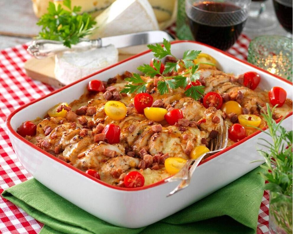 En rejäl och utsökt gratäng gjord på mör kyckling, krispigt bacon och en krämig, lätt kryddig sås. Serveras på en bädd av ris är det den perfekta rätten för en enkel och god familjemiddag.