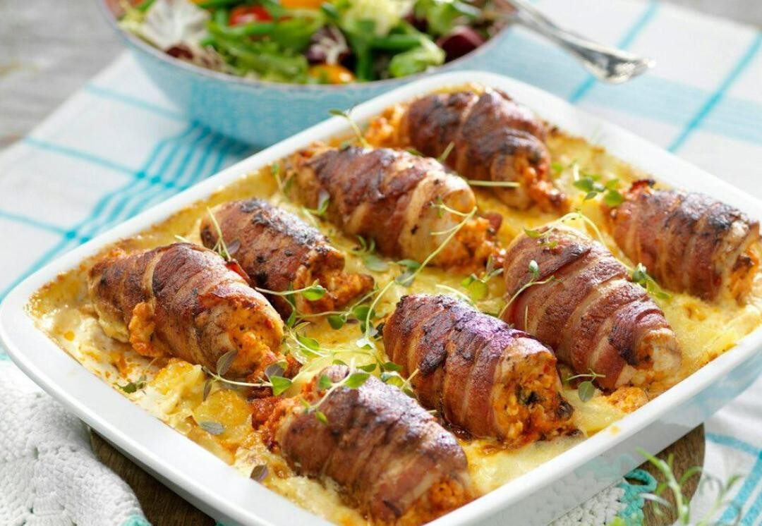 En läcker och festlig rätt: möra kycklingrullar fyllda med pesto, fetaost och basilika, inlindade i krispigt bacon och serverade på en krämig potatisgratäng dauphinoise. Ett perfekt recept för en speciell middag med familj eller vänner.