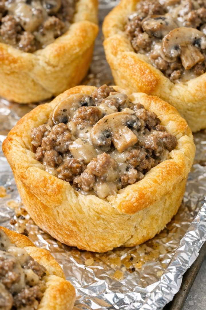 Min moster bar först med sig en kastrull med dessa små halvmåneformade nötkötts- och svampmuggar till vår kyrkas vårpotluck för flera år sedan, och jag minns fortfarande hur snabbt de försvann från det långa fällbordet vid de målade glasfönstren. De är den typen av praktiska, enkla recept som mellanvästerns kockar förlitar sig på när det finns en folkmassa att mata och inte mycket tid: bara halvmåneformad rulldeg, nötfärs och en burk krämig svampsoppa. Degen blir gyllenbrun och flagnande och omsluter en mysig fyllning som smakar som en snabb nötkötts- och svampgryta som du kan äta med fingrarna. Det här är den typen av recept som skickas runt på handskrivna kort, stänkta med lite sås och fulla av goda minnen.
