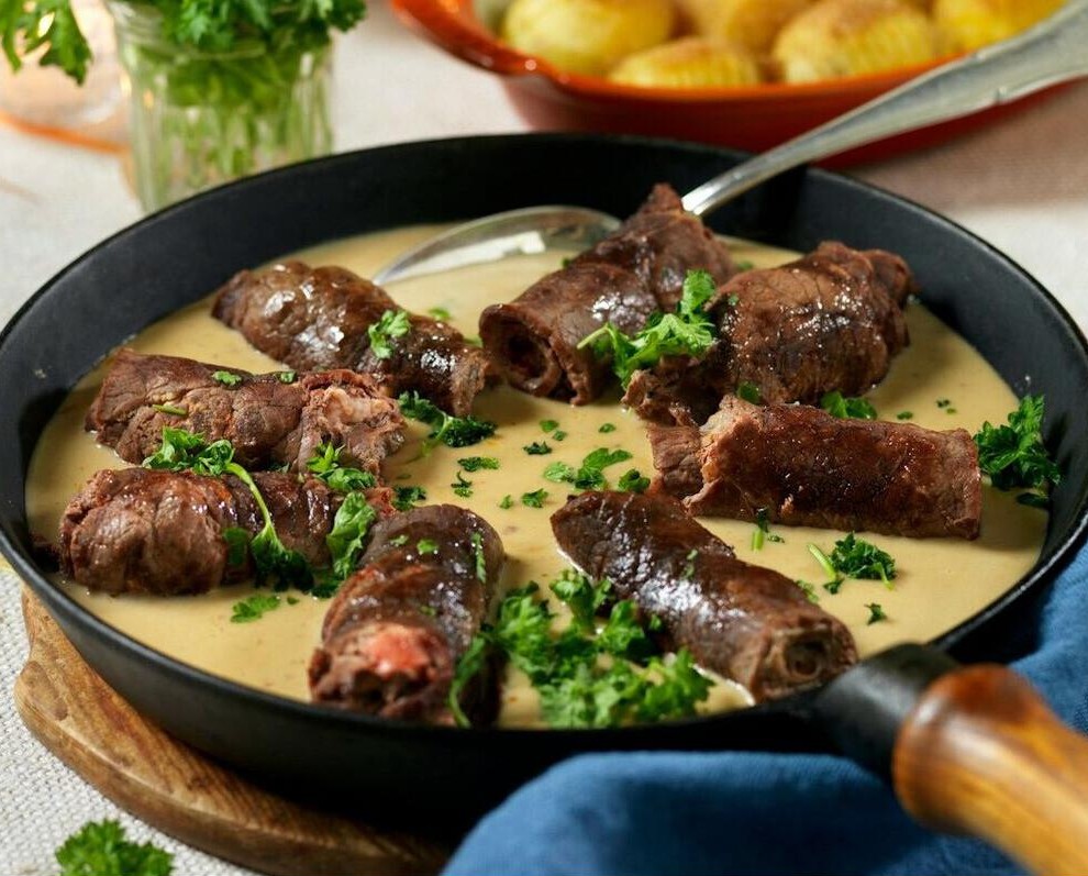 Läckra nötköttsrullader fyllda med bacon och dijonsenap, sjudna i en smakrik krämig sås och serveras med krispiga Hasselbackspotatisar. En rejäl rätt perfekt för en familjemåltid.