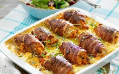Kyckling- och baconrullar på potatis dauphinoise ⏱ Tillagningstid: 60 minuter 🍽 Räcker till: 4 En läcker och festlig rätt: möra…