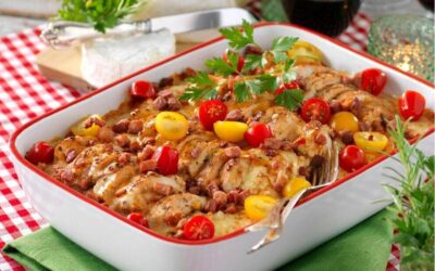 Kyckling- och bacongratäng på en bädd av ris ⏱ Tillagningstid: 50 minuter 🍽 Portioner: 4 En rejäl och utsökt gratäng…