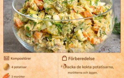 🛒 Ingredienser: 🥔 3 medelstora potatisar 🥕 2 morötter 🥒 4 inlagda gurkor 🥚 3 hårdkokta ägg 🧅 1 liten…