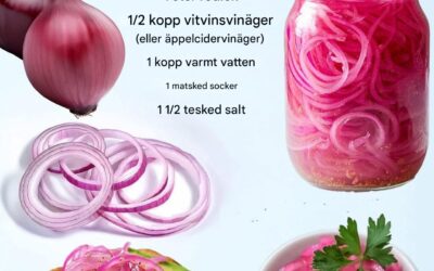 Ingredienser: 1 stor rödlök, tunt skivad 1/2 dl äppelcidervinäger 1/2 dl vatten 1 msk strösocker 1 1/2 tsk salt Valfria tillsatser: 1…