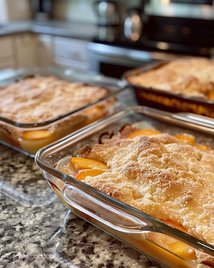 2. Ta en gryta på 23x33 cm och häll de sirapsiga persikorna rakt ner i botten. Bred ut dem för att skapa en rabatt lika inbjudande som en solfläck på verandan.