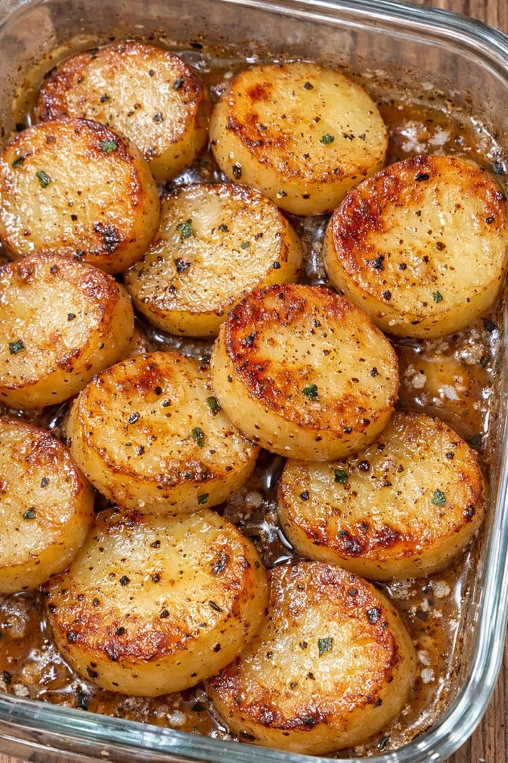 En kockvän visade mig det här enkla sättet med potatis för flera år sedan, och jag har aldrig riktigt kommit över konsistensen. De tjocka skivorna rostas i ugnen med bara smör, buljong och lite salt tills de är brynta på toppen och smältande krämiga inuti, nästan som små potatiskrämer. Det påminner mig om den typen av rejäla, enkla rätter vi serverade efter långa dagar på gården – enkla ingredienser, behandlade med lite omsorg, som förvandlas till något speciellt nog för söndagsmiddagen men tillräckligt enkelt för en vardagskväll.