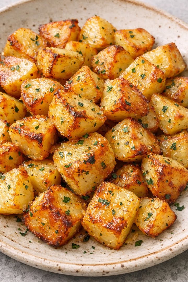 En trevlig Amish-dam på vår lokala bondens marknad förde vidare den här metoden till mig för flera år sedan, och jag har inte tillagat potatis på något annat sätt sedan dess. Det är lika enkelt och ärligt som hon beskrev det: bara potatis, smör, salt och en nypa torkad persilja. Tricket ligger i hur man rostar dem – varm ugn, gott om plats och inget krångel. Resultatet är ett stort stengodsfat med krispigt kanta, gyllenbruna potatisbitar, glittrande av smör och beströdda med gröna fläckar, den typen av rätt som känns hemma på ett söndagsbord eller vilken vardagskväll som helst när man vill ha något varmt och mysigt utan mycket arbete.