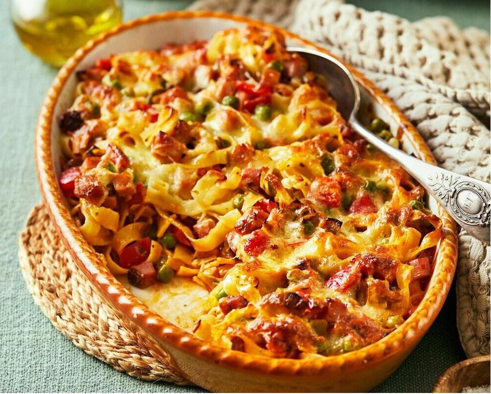 Symöteslåda är en mycket populär pastagratäng gjord med kassler (rökt fläskkött), purjolök, paprika och en krämig ostsås. En rejäl och enkel rätt, perfekt för en snabb middag.
