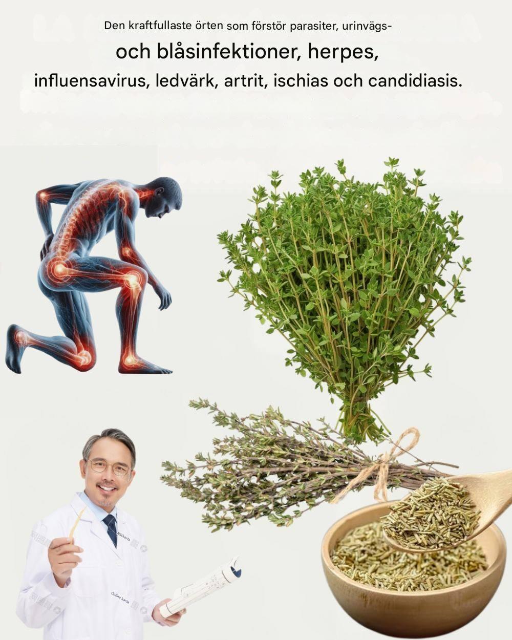 Tillredning: Lägg timjan i en kopp, tillsätt varmt vatten, täck över och låt dra i 5–10 minuter. Sila och drick varmt.