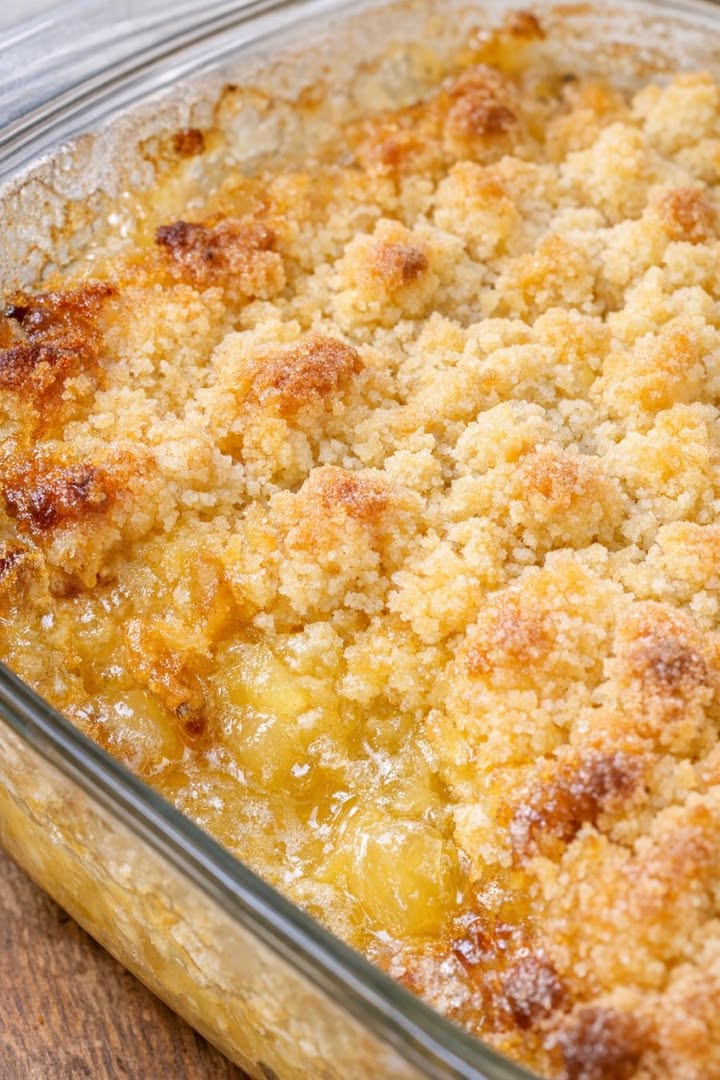 Häll hela burken krossad ananas, inklusive all juice, i den förberedda ugnsformen i glas. Använd en spatel eller baksidan av en sked för att breda ut ananasen i ett jämnt lager som täcker botten av formen helt.