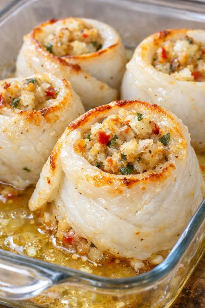 Placera en liten hög med krabbkött nära den bredare änden av varje flundrafilé. Rulla försiktigt filén runt krabban, börja från krabbänden och rulla mot den tunna stjärtänden, vik in stjärtänden om det behövs så att den håller ihop. Lägg de fyllda flundrarullarna med skarven nedåt i den förberedda glasformen och lägg dem tätt ihop så att de håller sig tätt under gräddningen.