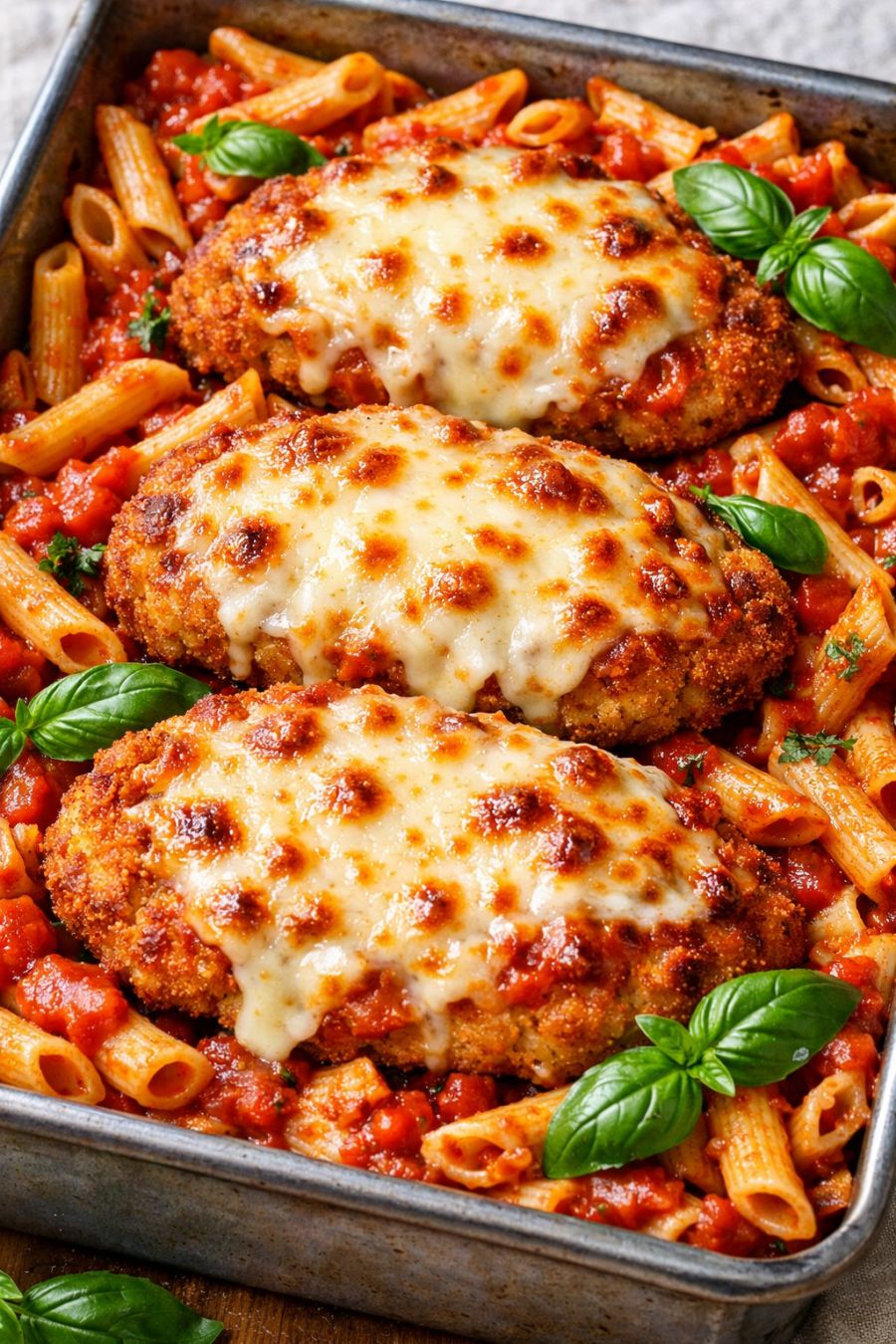 Placera de panerade, frysta kycklingbiffarna direkt ovanpå den såsiga råa pennen, med mellanrum mellan dem så att varje portion pasta har en biff ovanpå. Detta är det viktigaste steget: biffarna ligger precis ovanpå den okokta pastan i den rektangulära bakformen.