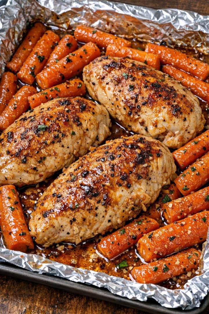 Denna ugnsbakade morotskyckling med fyra ingredienser från Amish är en av de där enkla små middagarna som på något sätt känns som en kram på en tallrik. Jag fick den av min Amish-svägerska för flera år sedan, klottrad på baksidan av ett kuvert efter söndagsmiddagen, och min familj har bett om den hela veckan ända sedan jag gjorde den igen. Det är bara kycklingbröst, morötter, en enkel söt och salt glasyr och lite smör, allt rostat tillsammans på en folieklädd panna tills morötterna är möra, kycklingen är saftig och stekpannan förvandlas till en glänsande orange glasyr. Det är den typen av praktiskt, enkelt bondrecept som passar perfekt in i en hektisk vardagskväll men ändå smakar som något din mormor kanske har gjort.