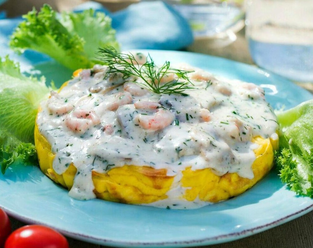 En härligt krämig ugnsbakad omelett serverad med en doftande gryta av räkor, svamp och örter. Perfekt för en lätt och elegant middag för två.