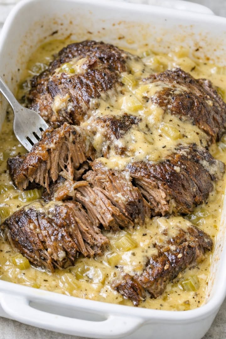Grädda steken i 3 till 3 1/2 timmar, eller tills köttet är mycket mört och lätt kan lossas med en gaffel. Undvik att öppna ugnen ofta; varje gång du lyfter på locket förlorar du värme och fukt.