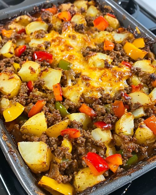 Rör i de tärnade röda, gula och gröna paprikorna tillsammans med den tärnade potatisen. Stek i cirka 5 minuter och låt grönsakerna mjukna något.