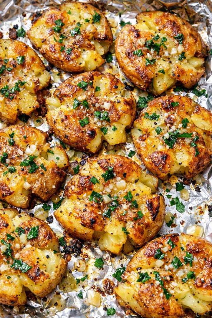Bred ut de varma potatisarna på den folieklädda bakplåten och lämna lite mellanrum mellan varje potatis. Använd botten av ett stadigt glas, ett måttglas eller en potatisstöt och tryck försiktigt ner varje potatis tills den plattas till ungefär 1,2 cm tjocklek. Försök att inte bryta isär dem helt; du vill ha skarpa kanter men mitten fortfarande mestadels intakt.