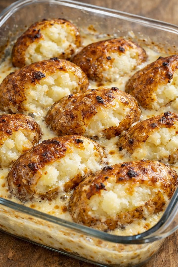 Lägg hela eller halverade potatisar i ett enda lager i glasformen, med snittytan nedåt om de är halverade. De ska ligga tätt ihop men inte staplas.