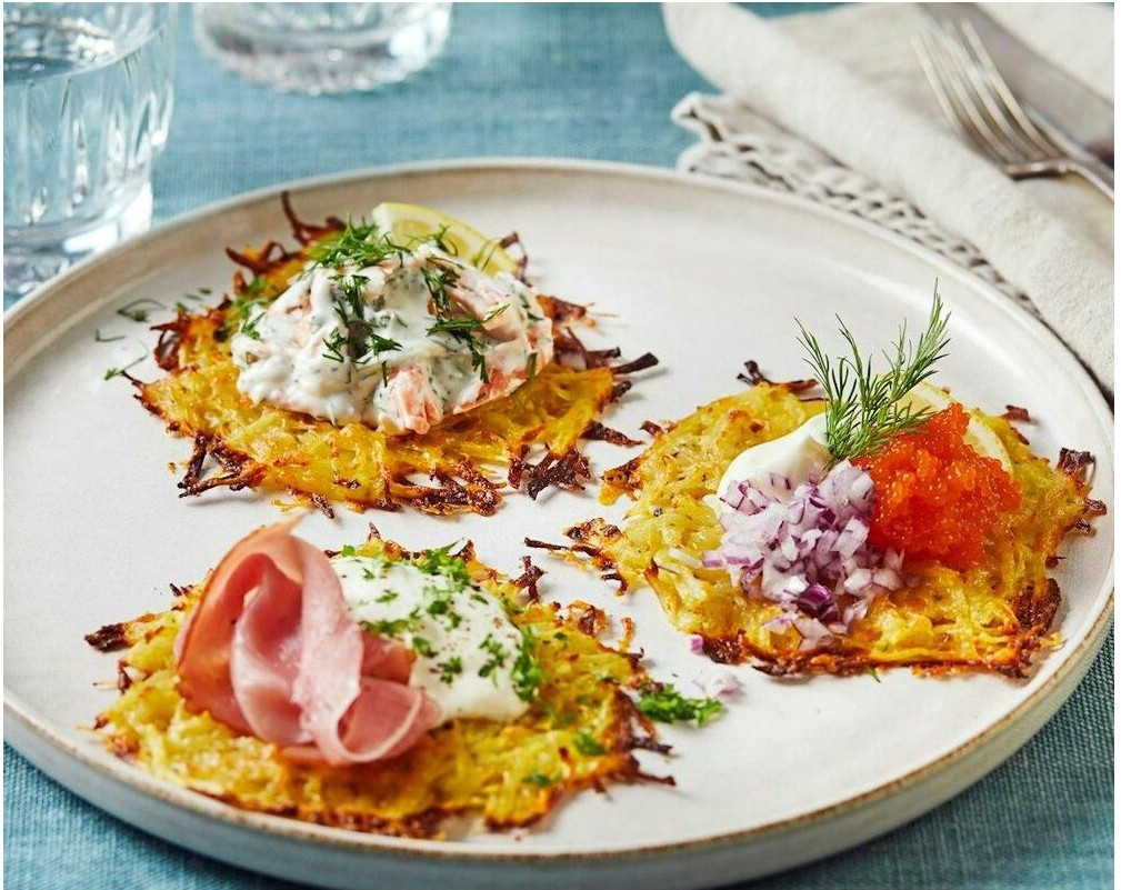 En elegant och utsökt rätt, perfekt som huvudrätt för 2 eller en raffinerad förrätt för 6. Räkorna är ugnsbakade och serveras med pålägg av rökt lax, skinka och pepparrot, eller fiskrom, perfekt som förrätt eller festmiddag.