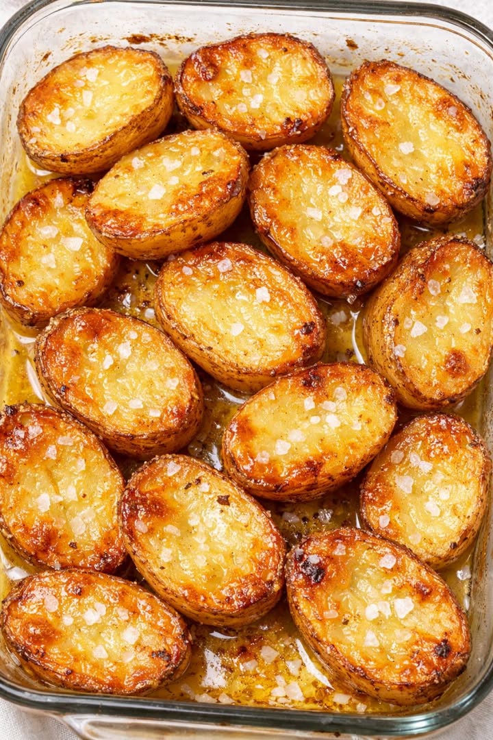 Förvärm ugnen till 200 °C. Smörj en glasform (ca 23 x 33 cm) lätt med en liten mängd smör för att förhindra att potatisen fastnar och för att hjälpa dem att bli krispiga.
