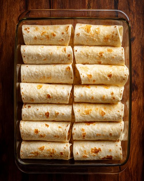 Placera cirka 2 matskedar fyllning på ena sidan av varje tortilla och rulla sedan ihop dem hårt.