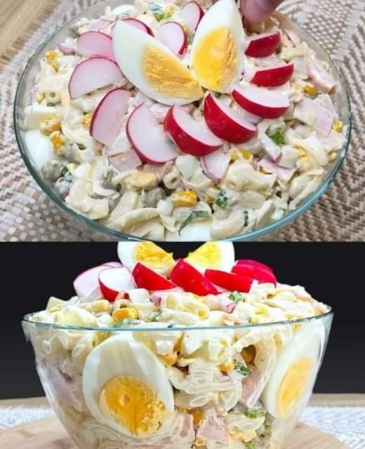 Upptäck en utsökt sallad som kombinerar bekvämligheten hos klassiska ingredienser med en touch av elegans, perfekt för underhållning eller en mysig måltid hemma. Med sin harmoniska blandning av smaker och texturer visar denna sallad upp skönheten i enkelhet i matlagning.